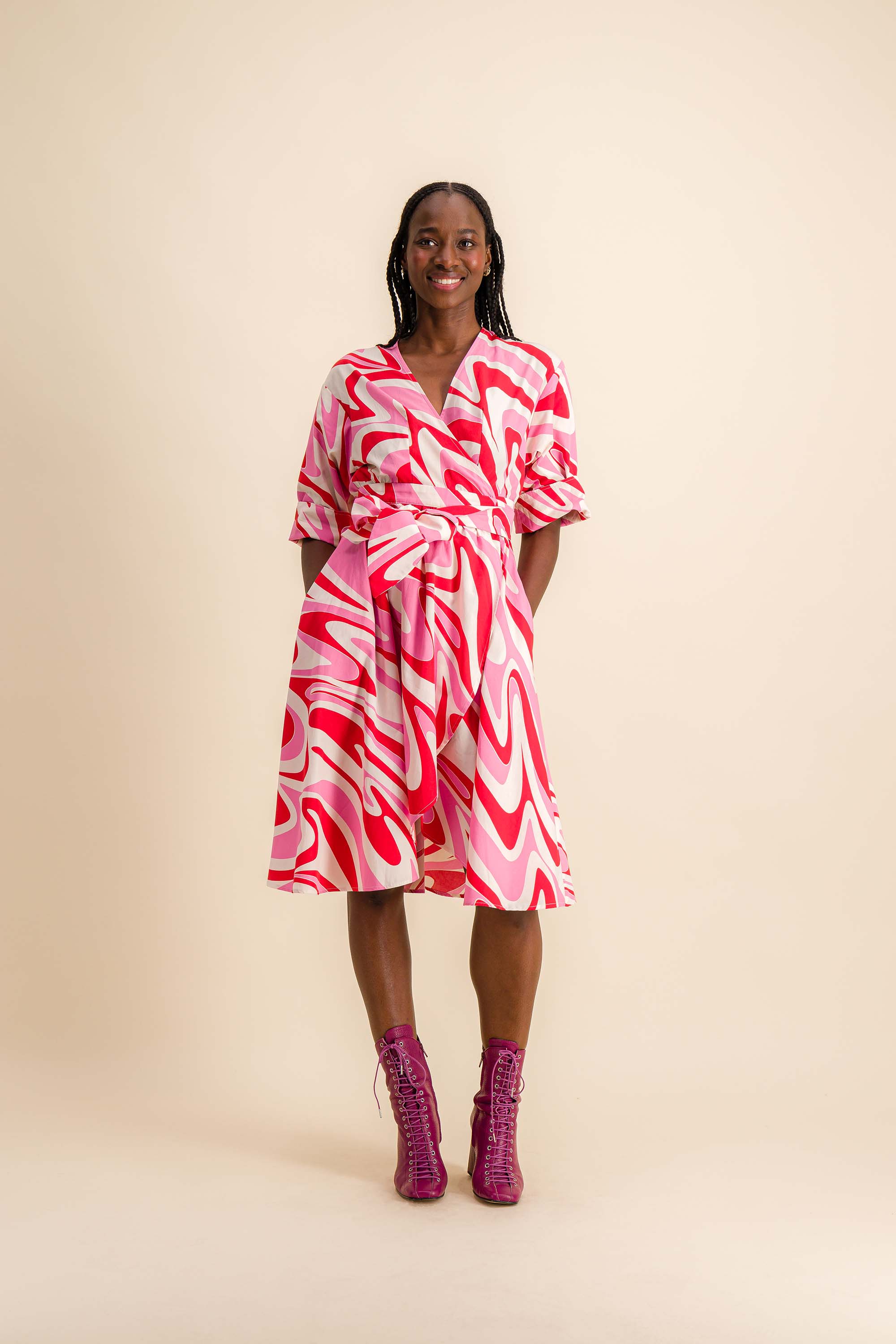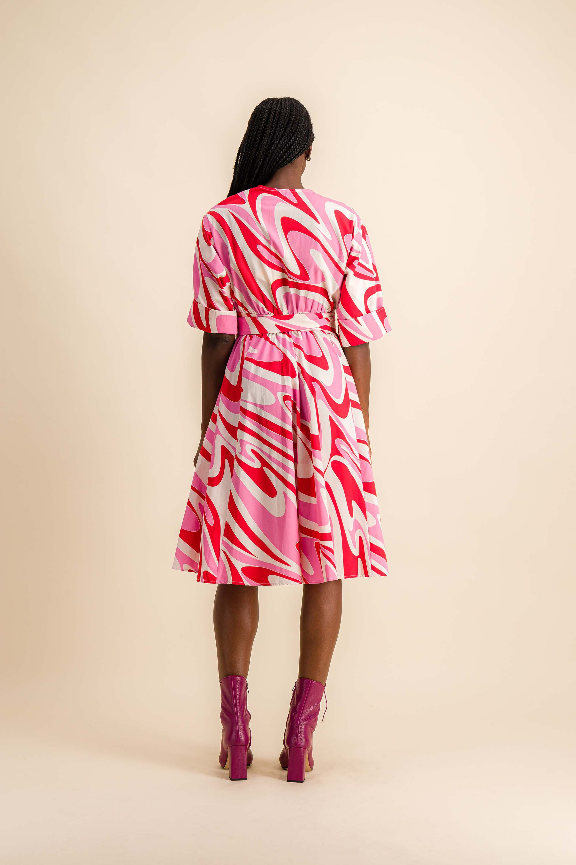 V-neck wrap dress. Midi length at back, shorter at front. Elbow-length sleeves to turn inside out. Fastened with a belt to be slipped through the side buttonhole and tied at the waist by crossing the two fronts. Pockets in side seams.