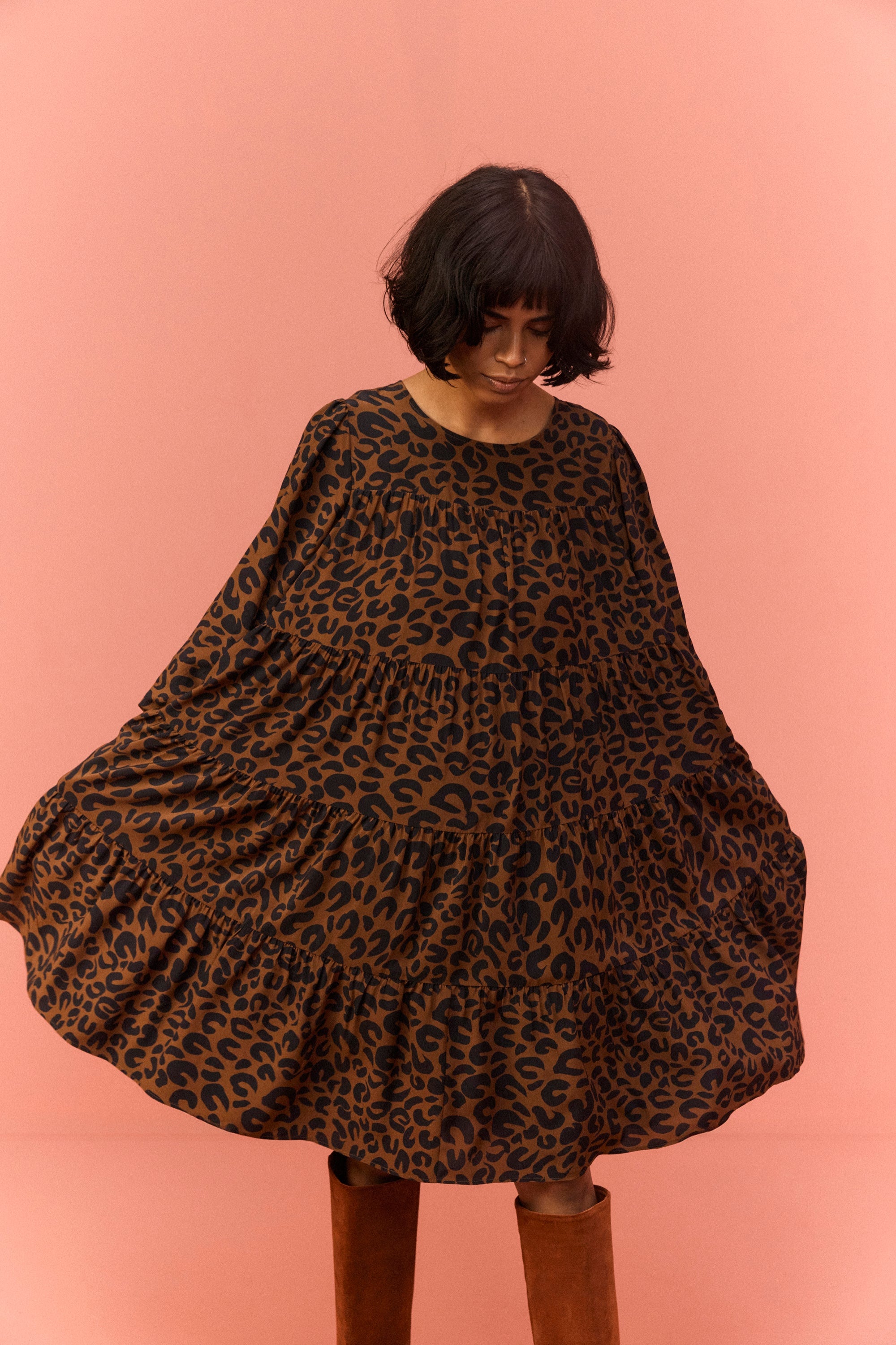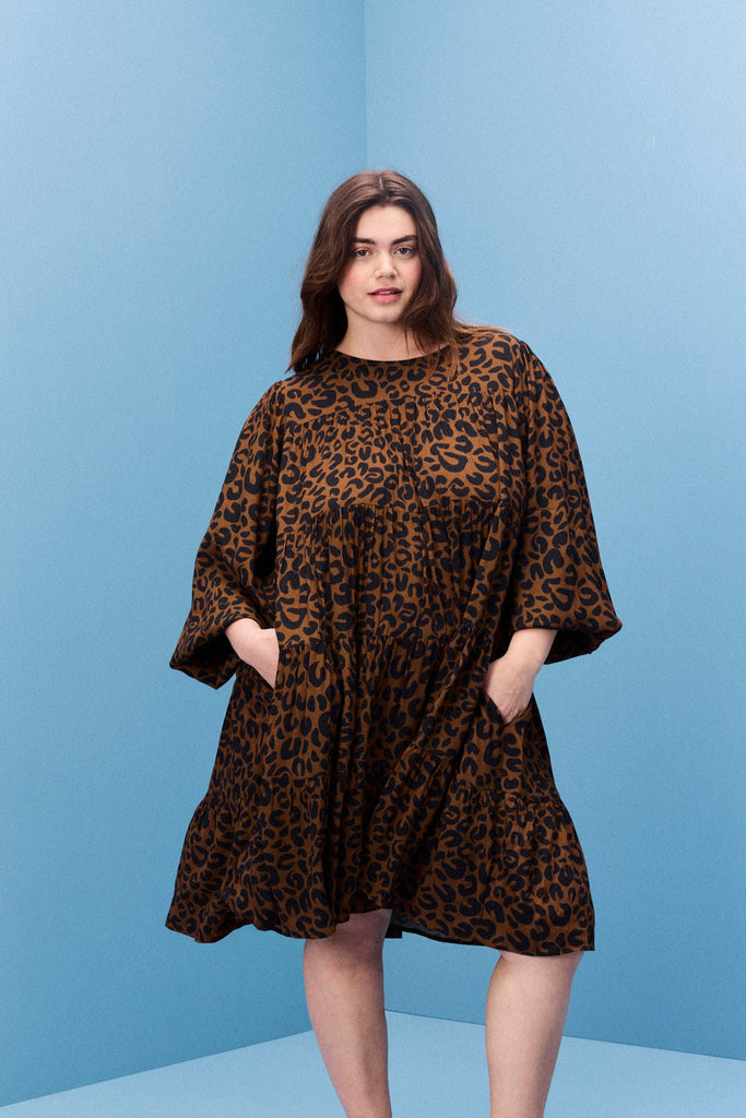 Loose-fitting leopard dress with various ruffles. Over-the-knee length and puffed sleeves tightened at the cuffs with elastic. Leopard dress with side pockets.