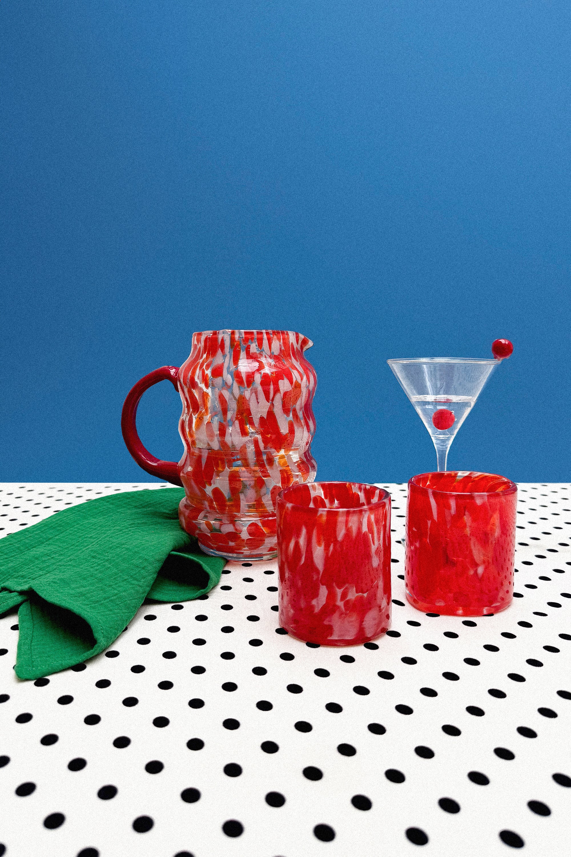 100% speckled glass. Clean with a soft, clean, slightly dampened cloth / Leave to dry in the shade.
