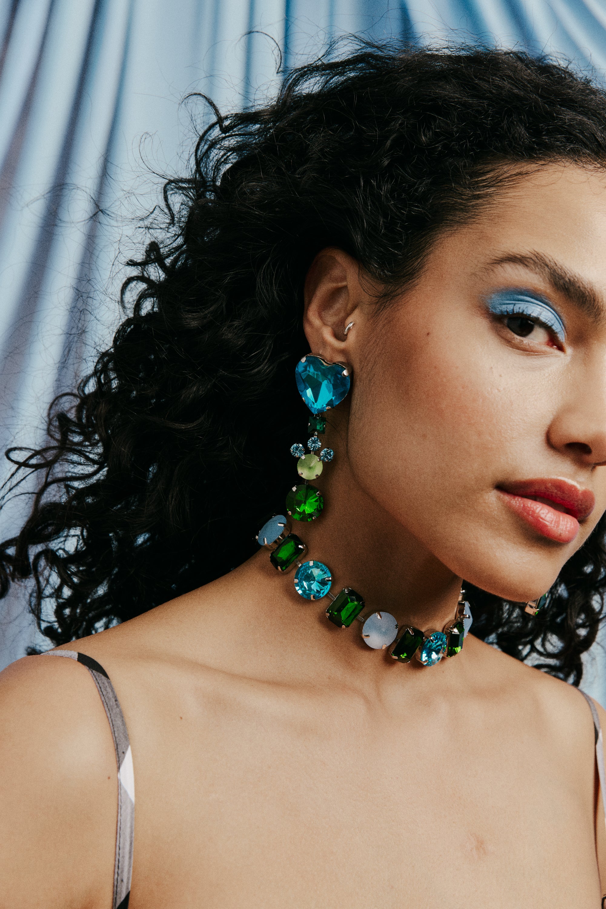 Boucles d’oreilles pendantes en laiton trempées dans du palladium ornées de strass verts et bleus.