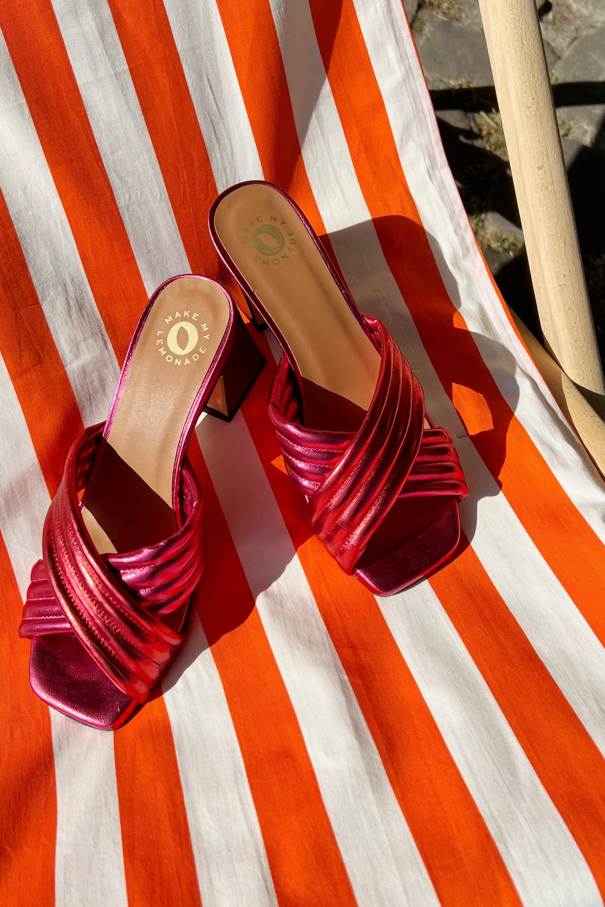 Mules à talon de 5cm, avec deux bandes croisées de coloris différents, sur le coup de pied.