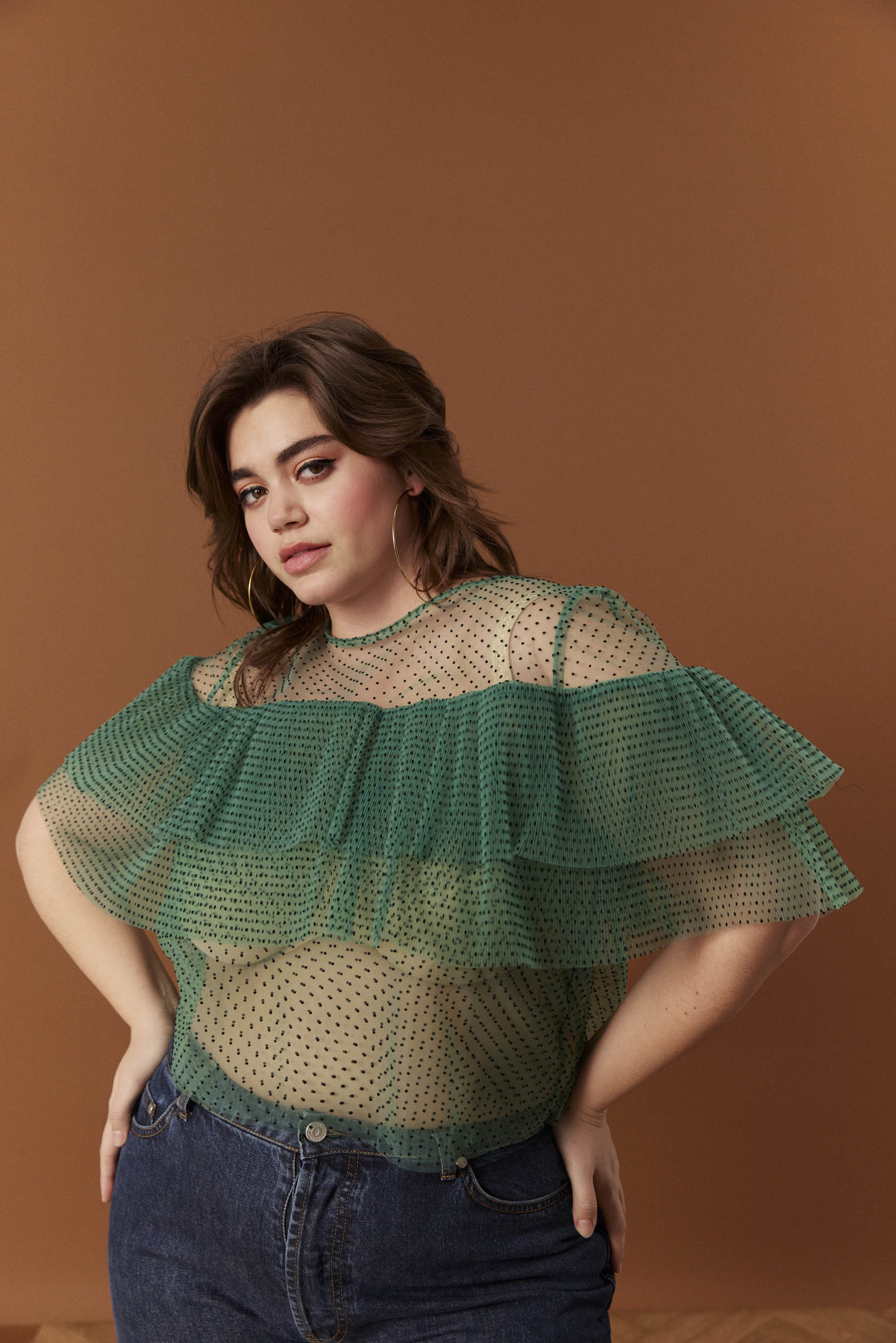 Top transparent en tulle avec plumetis. Coupe droite. Manches courtes. Longueur en dessous de la taille. Deux bandes de tissu plissé sur la poitrine et les manches. Encolure ronde fermée avec un ruban dans le dos.